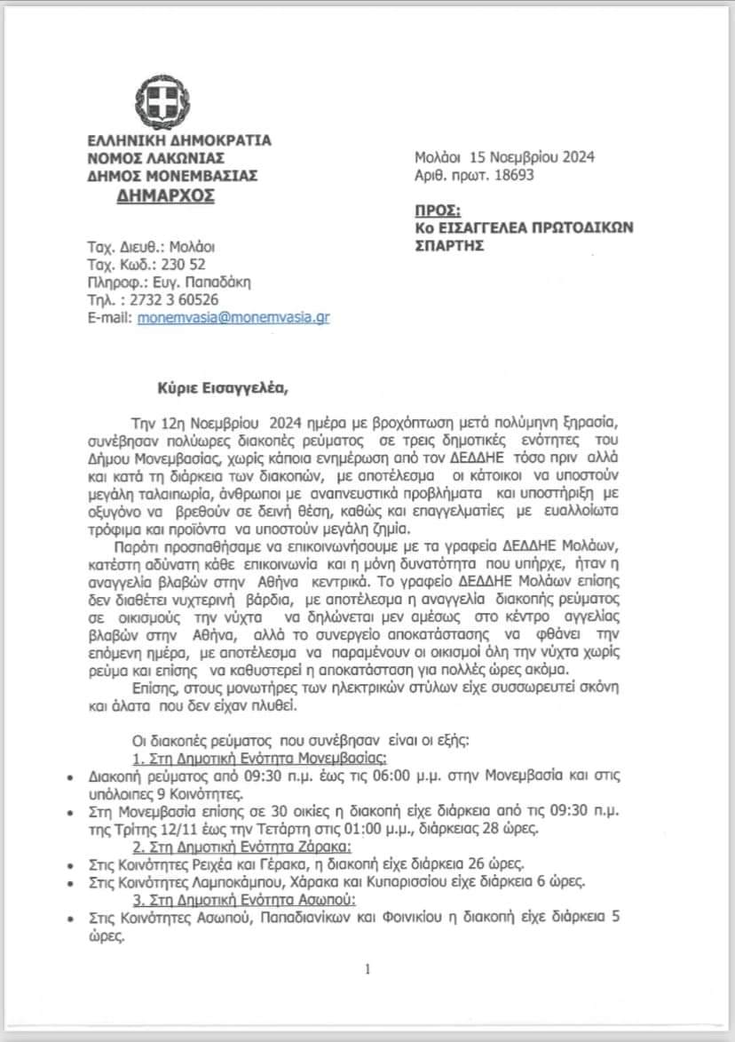 Επιστολή προς τον εισαγγελέα πρωτοδικών σπάρτης για τις διακοπές ρεύματος
