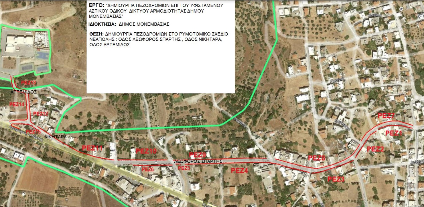 - Κατασκευή πεζοδρομίων στη Νεάπολη επί των οδών Λεωφ. Σπάρτης, Νικηταρά και Αρτέμιδος συνολικού μήκους περίπου 1.910 μ. με μεταβλητό πλάτος από 1,20 έως 1,80 μ. Το πεζοδρόμιο θα επιστρωθεί με πλάκες πεζοδρομίου 40χ40 και θα έχει λωρίδα όδευσης ΑΜΕΑ και θα τοποθετηθούν 90 ιστοί με φωτιστικά σώματα με τις απαραίτητες υποδομές οδικού φωτισμού (Πίλαρ, βάσεις, φρεάτια, σωληνώσεις, καλωδιώσεις, γειώσεις κ.τ.λ.).