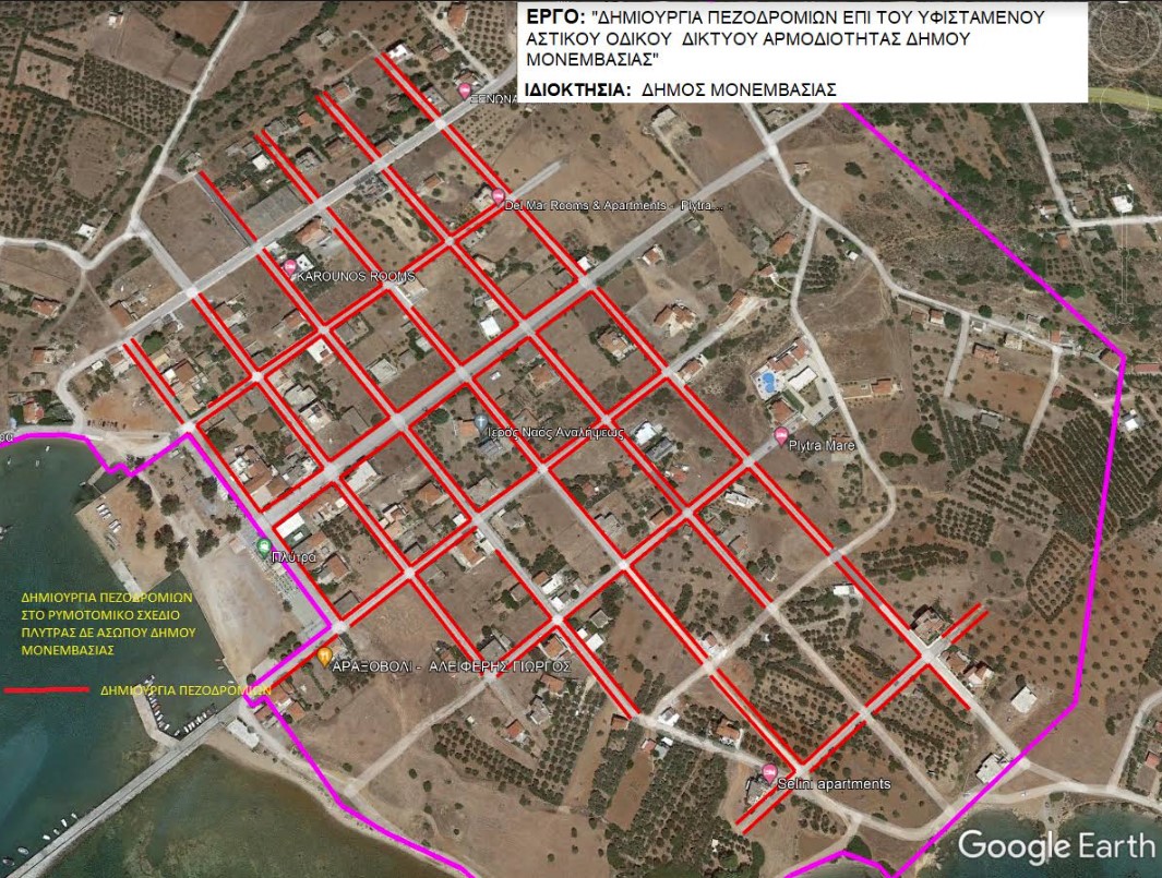 Στις 10.08.2023 υπογράφηκε η σύμβαση για τη δημιουργία πεζοδρομίων επί του υφιστάμενου αστικού δικτύου αρμοδιότητας Δήμου Μονεμβασίας προϋπολογισμού 1.492.800,00 €, έργο το οποίο αφορά:
