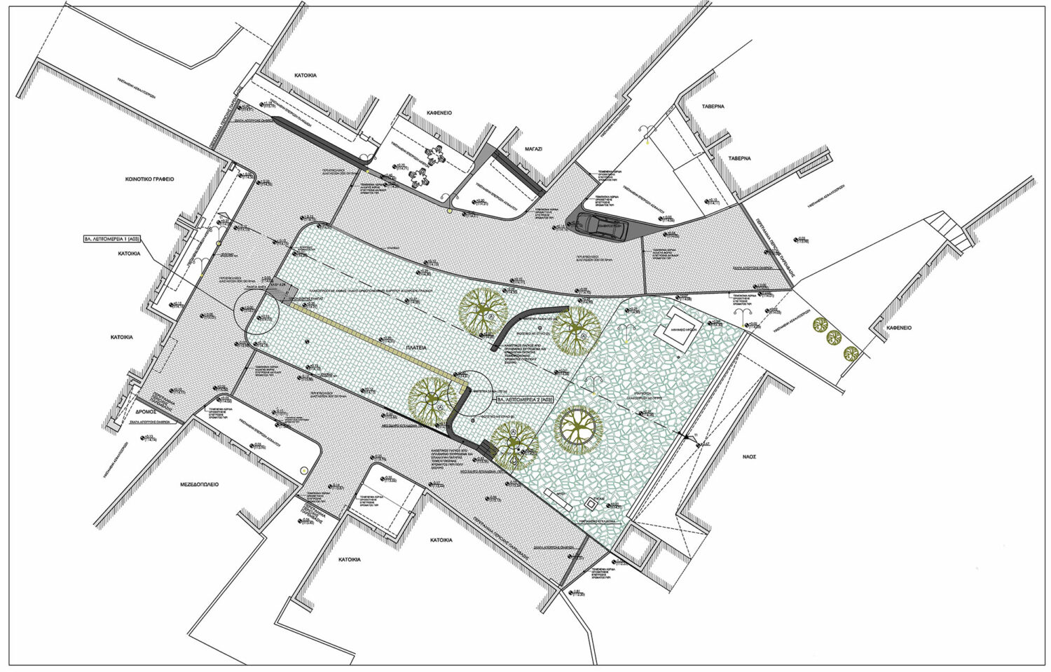 -Οριοθέτηση των δρόμων και της κυκλοφορίας των αυτοκινήτων, περιμετρικά της περιοχής παρέμβασης, με κατάλληλες πλακοστρώσεις και διαγραμμίσεις.